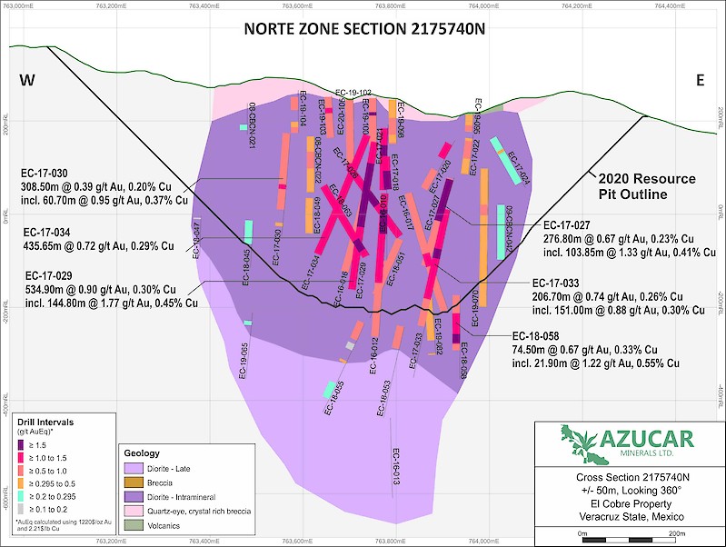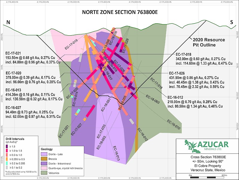 - Norte Zone: All five holes drilled in the Norte Zone prior to 2016 intersected porphyry-style mineralisation. Hole 08-CBCN-022, one of the deepest holes drilled at Norte in 2008, returned values of 0.14% Cu with 0.19 g/t Au over 259 m and 08-CBCN-19 intersected 41.15 metres averaging 0.42 g/t gold and 0.27% copper to the end of the hole at 187.45 metres. Drilling at the Norte Zone in 2016 and 2017 resulted in intersections including 114.60 metres grading 1.33 g/t Au and 0.48% Cu (Hole EC-17-018, see press release of April 5, 2017), 80.50 metres grading 1.34 g/t Au and 0.46% Cu (Hole EC-16-012, see press release of October 24, 2016), and 70.45 metres grading 2.32 g/t Au and 0.59% Cu (Hole EC-17-026, see press release of July 25, 2017). Continued drilling through 2018 and 2019 has culminated in the mineral resource estimate announced on September 29, 2020.