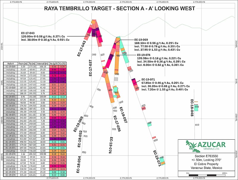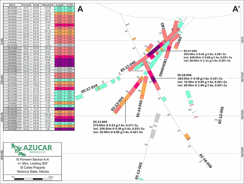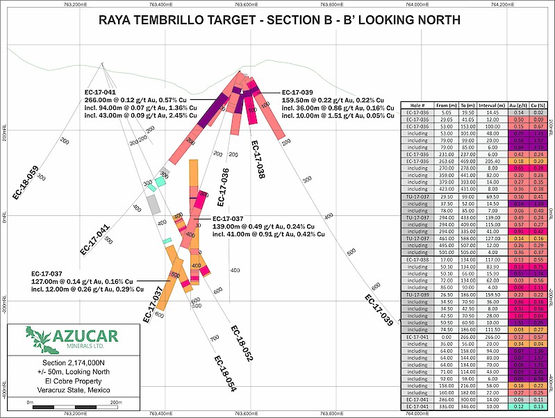 - Encinal Zone: The Encinal zone is located approximately 1km south of the El Porvenir zone. Previous drilling at Encinal has intersected a highly altered breccia pipe containing fragments of stockwork veining and porphyry mineralisation across which 18.28 metres returned 1.42 g/t Au and 0.10% Cu (Hole CB5). The breccia pipe occurs in a large alteration zone, IP chargeability high and magnetics low which has not been tested to depth. On June 19, 2017 Azucar announced that a new area of exposed stockwork quartz veining and gold mineralisation had been identified in the Encinal Zone. On June 29, 2017 Azucar announced the results of initial drilling on this exposed stockwork (Hole EC-17-025) which returned results including 34.47 metres grading 0.73 g/t Au and 0.20% Cu.