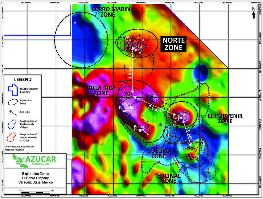 To date, Azucar has discovered five copper-gold porphyry zones within the property along an approximately 4-5km trend, stretching from Norte down to Encinal in the southeast. These zones are defined by distinct Cu-Au soil anomalies, discrete, positive magnetic features, a large IP chargeability anomaly, and drilling.