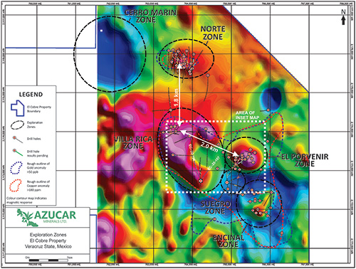 The five copper-gold porphyry zones within the El Cobre Project are known as NORTE, VILLA RICA, EL PORVENIR ENCINAL and SUEGRO, and are defined by distinct Cu-Au soil anomalies, discrete, positive magnetic features and a large IP chargeability anomaly. The largest zone is the VILLA RICA ZONE which has only seen limited initial exploration drilling. An overview of drilling to date in the various zones is provided below.