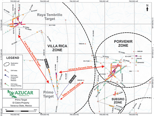 VANCOUVER, B.C. Azucar Minerals Ltd. (“Azucar” or the “Company”) (TSX-V: AMZ; OTCQX: AXDDF) is pleased to provide an update and announce final results from drilling conducted earlier this year at the Primo target of the El Cobre porphyry copper-gold project in Veracruz State, Mexico.