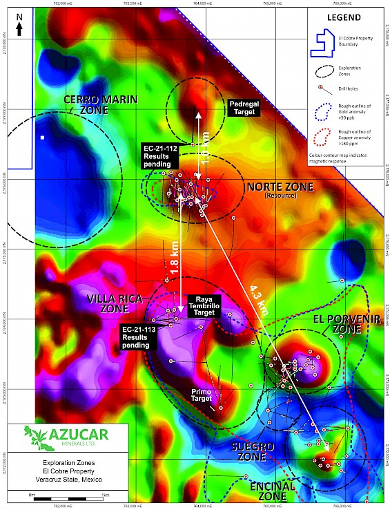 At the Villa Rica Zone, located about 1.8 km south of the Norte Zone, the Company plans to further explore the Raya Tembrillo Target. Initial drilling in 2017 on the Raya Tembrillo Target intersected two styles of mineralisation; hypogene copper-gold porphyry mineralisation (115.00 metres of 0.57 g/t gold and 0.27% copper, see press release of November 28, 2017) and near surface enriched copper mineralisation with an apparent tabular distribution (94.00 metres of 1.36% copper; see press release of December 13, 2017). At the Encinal Zone, located 4.3 kilometres to the southeast of the Norte Zone, the Company is conducting a more thorough review of the geological, geochemical and geophysical datasets in order to design a future drill program to follow-up past drill results. On June 29, 2017 Azucar announced the results of initial drilling on this exposed stockwork (Hole EC-17-025) that returned results including 34.47 metres grading 0.73 g/t Au and 0.20% Cu.